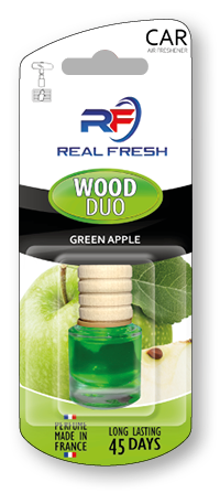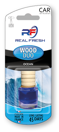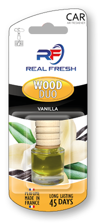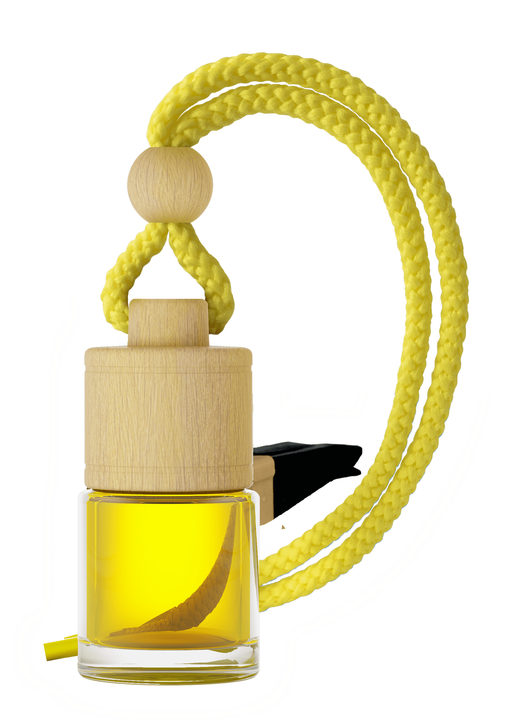 Samochodowy odświeżacz powietrza z płynem w szklanej butelce do zastosowania na lusterko wewnętrzne oraz kratkę wentylacyjną.